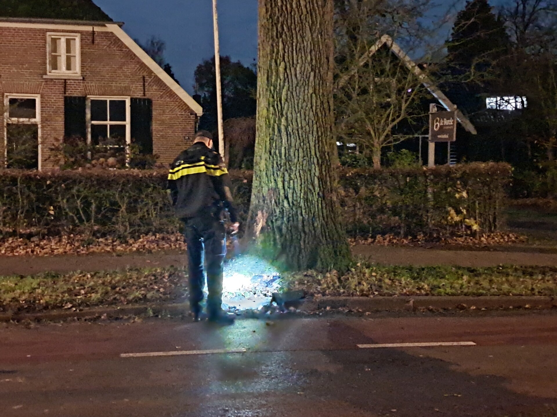 Ter hoogte van de Albert Heijn was een automobilist met zijn voertuig tegen een boom gereden. Getuigen meldden dat de bestuurder vermoedelijk eerst over de stoep reed en daarna met flinke snelheid frontaal op de boom botste. Door de harde klap tolde de auto over de weg en kwam pas tot stilstand aan de overkant. Opmerkelijk genoeg parkeerde de bestuurder de zwaar beschadigde wagen vervolgens netjes langs de weg.